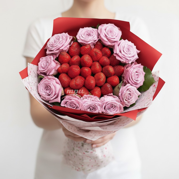 Букет из 11 розовых роз и клубники