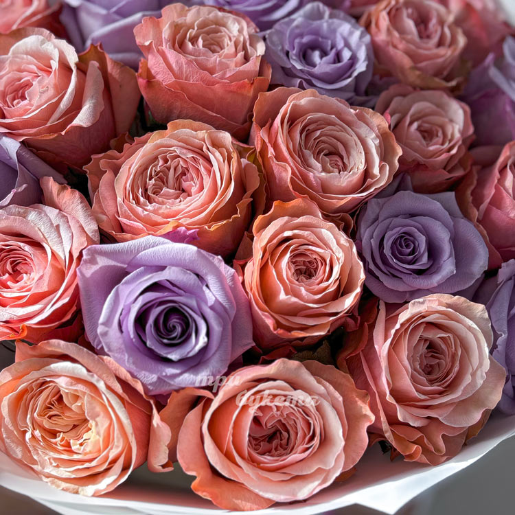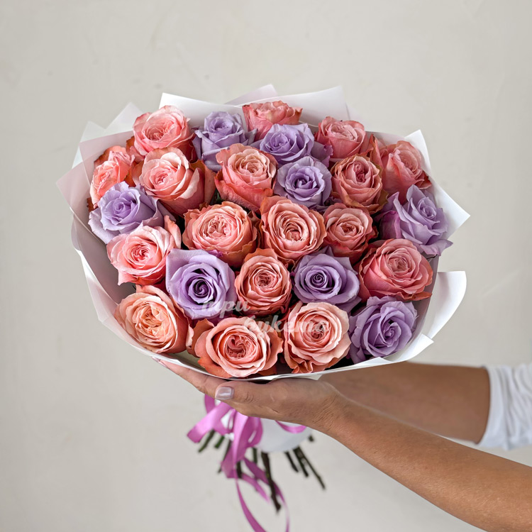 Букет из 25 персиковых и сиреневых роз