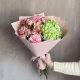 Букет персиковых кустовых роз и гортензий