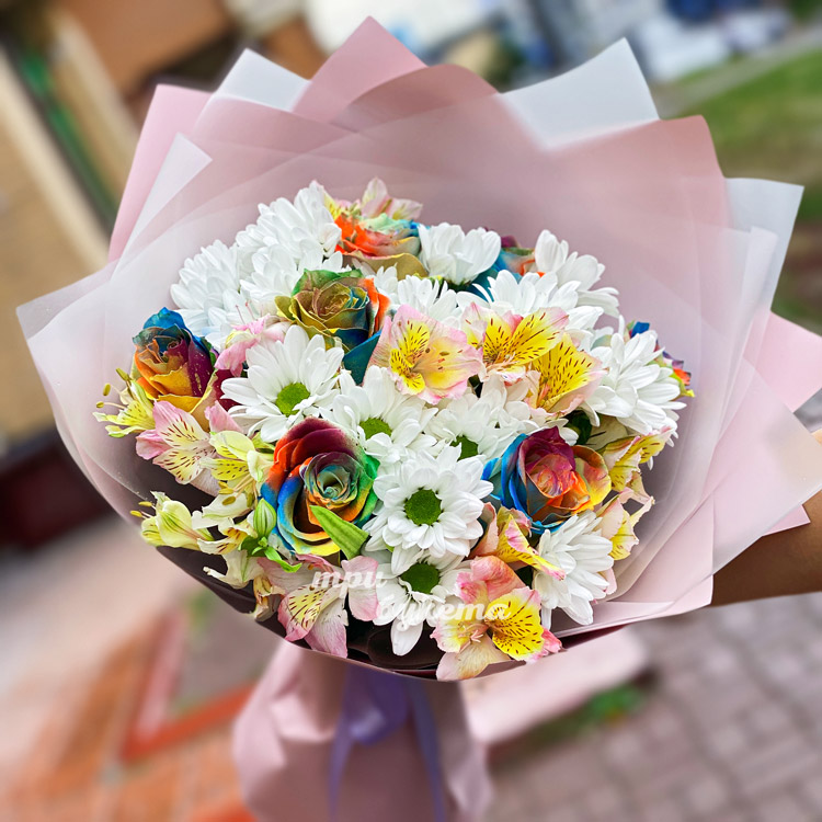 Букет радужных роз с белыми хризантемами