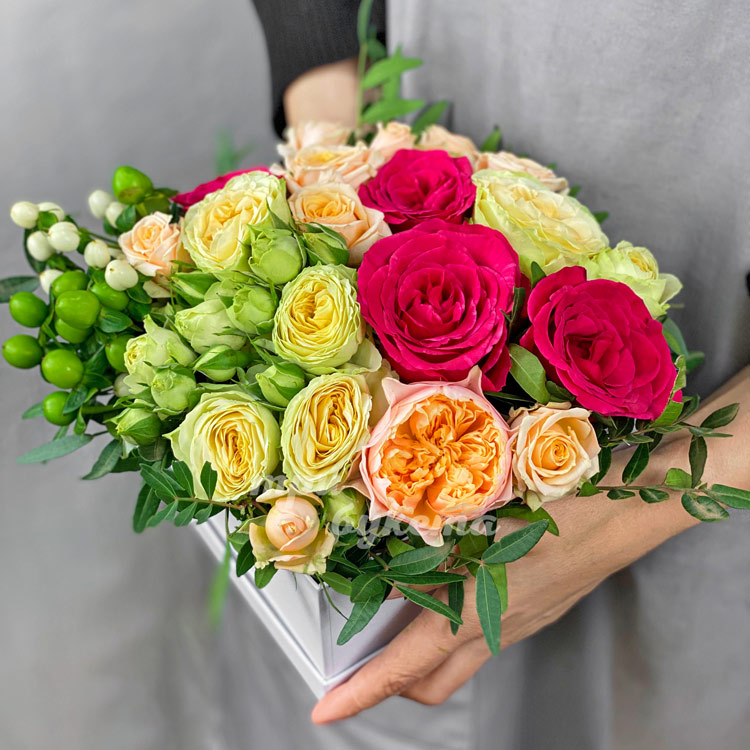 Коробка персиковых и розовых пионовидных роз