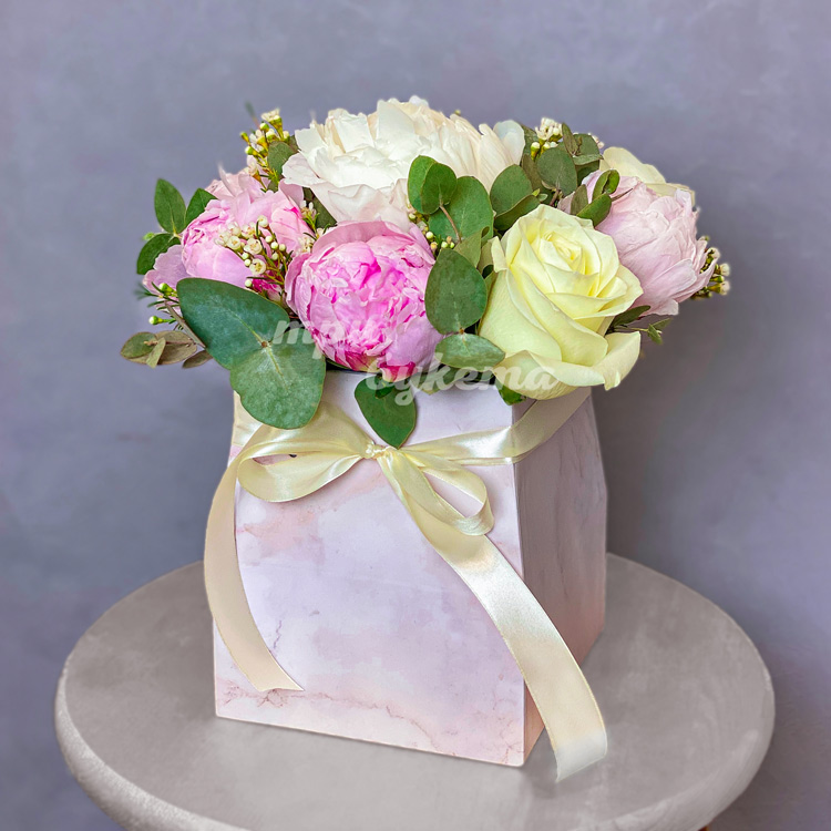 Коробка пионов с эвкалиптом