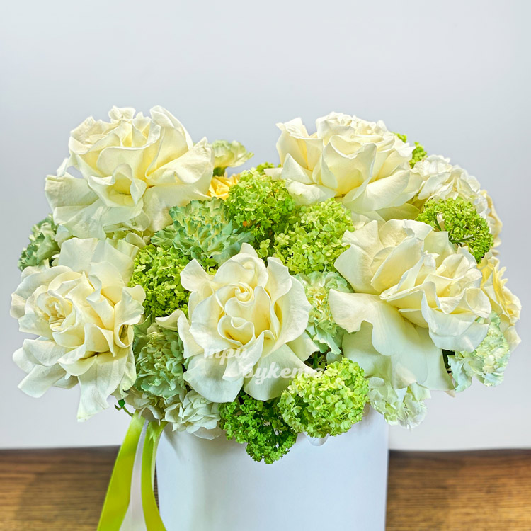 Коробка зеленых гвоздик, роз и вибурнума