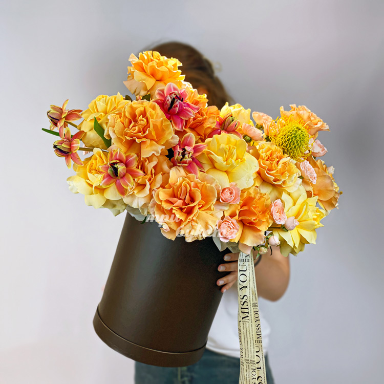 Коробка желтых французских роз с тюльпанами