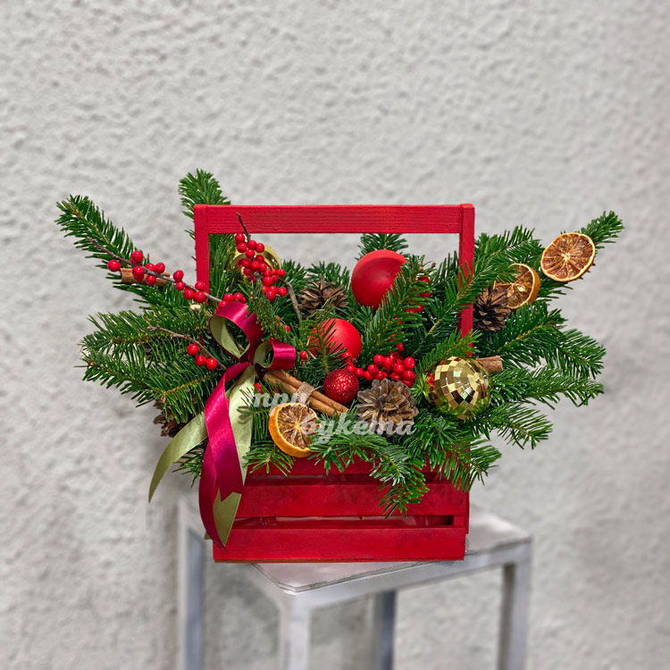 Красный новогодний ящик с хвоей и декором