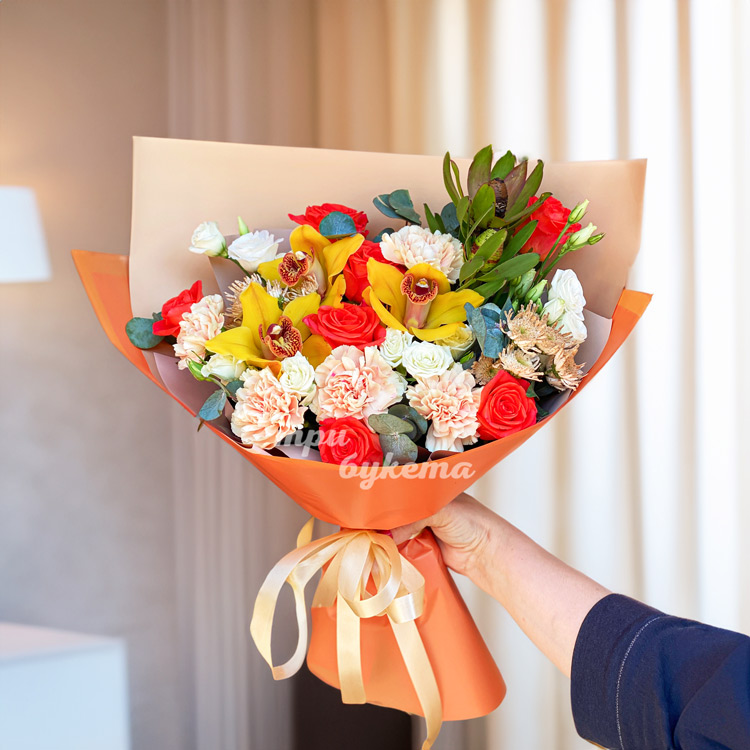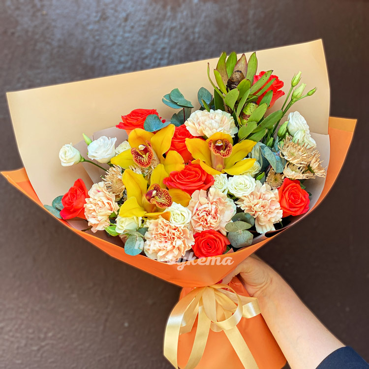 Оранжевый букет из орхидей и гвоздик