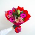 Яркий букет гербер, хризантем и тюльпанов